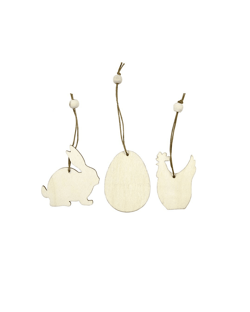 Puiset pääsiäiskoristeet ripustusnaruilla. Kuvioina pupu, kana ja muna. Kuviot kooltaan 6cm. Paksuus 3mm. Pakkauksessa kutakin kuviota 3 kpl.