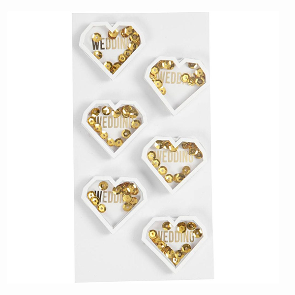 Ravistustarrat, joiden sisällä kultaisia paljetteja ja Wedding teksti. Tarran koko   noin 38mm x 35mm. Pakkauksessa 6kpl.