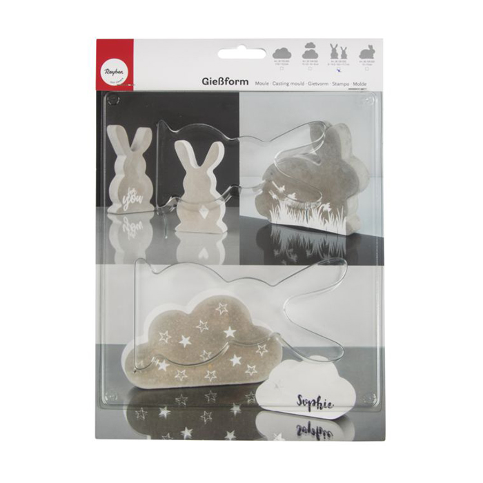 Monikäyttöinen kirkas muovimuotti askarteluun. Muotilla voit valaa hauskoja pupuja esimerkiksi kipsillä tai betonilla. Muottien koot 8×14,5cm ja 6,5×11,7cm.
