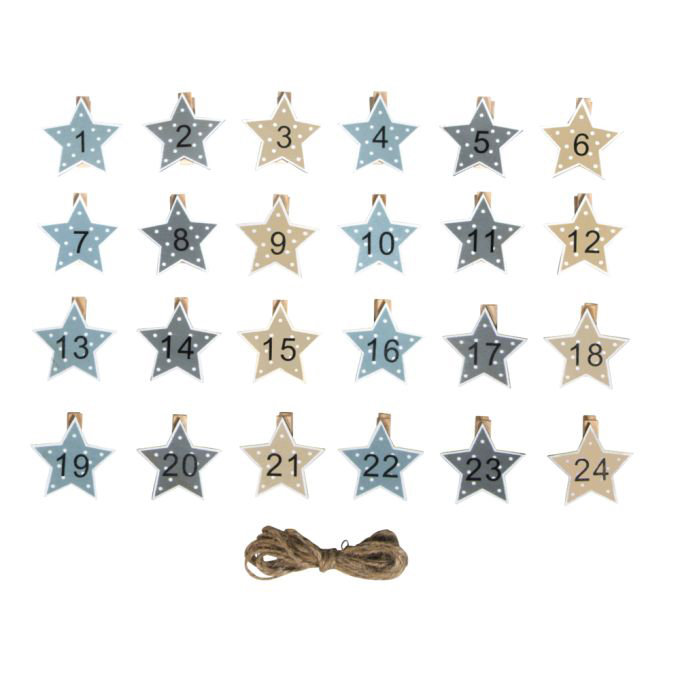 Puiset joulukalenterin numerot tähti kuvioisissa pyykkipojissa. Pyykkipoikien korkeus noin 4,5cm.  Pakkauksessa numerot 1-24 ja mukana tulee vyyhti juuttinarua.