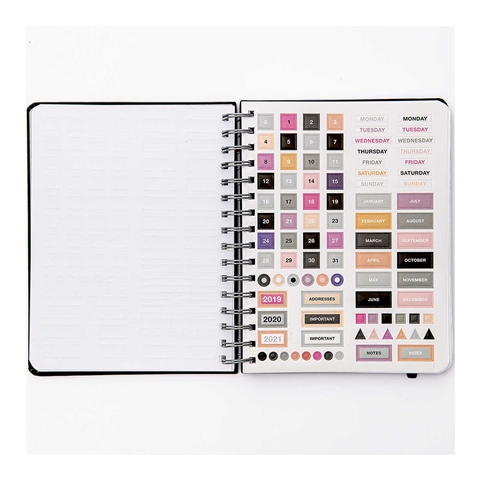Rico Designin Bullet Diary, päiväämätön kalenterikirja. Kirjan koko on 16x21cm ja siinä oon kierteet sekä kuminauha. Kalenterissa 198 numeroitua pistesivua ja 2 arkkia tarroja, joissa mm. numeroita, kuukausia ja viikonpäiviä englanninkielisillä teksteillä. Paperin vahvuus 120g/m2.