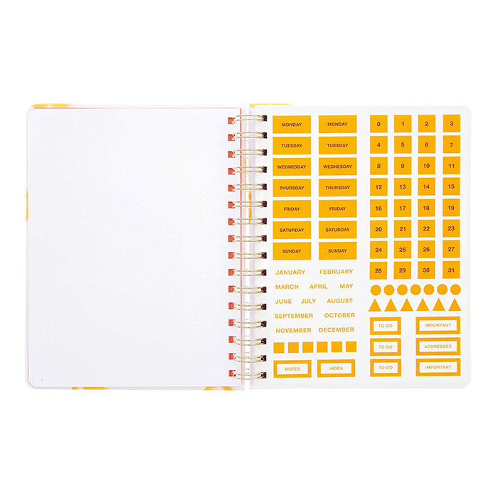 Rico Designin Bullet Diary, päiväämätön kalenterikirja. Kirjan koko on 16x21cm ja siinä oon kierteet sekä kuminauha. Kalenterissa 164 numeroitua pistesivua ja 2 arkkia tarroja, joissa mm. numeroita, kuukausia ja viikonpäiviä englanninkielisillä teksteillä. Paperin vahvuus 120g/m2.