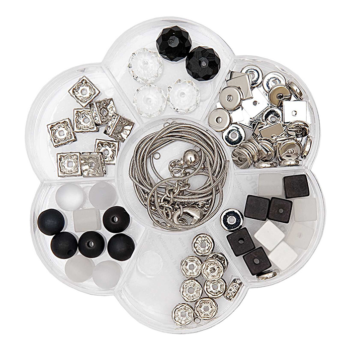 Rico Design Polaris Flower helmisetti sisältää yhteensointuvan lajitelman erilaisia lasi, metalli- ja muovihelmiä, joista saat tehtyä upean kaulakorun.