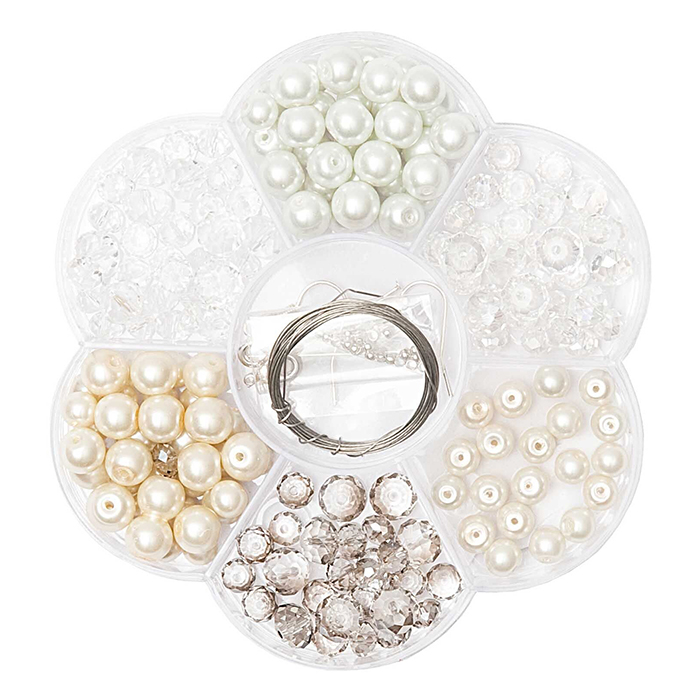 6mm ja 8mm pyöreitä lasihelmiä, 6mm ja 8mm lasisia särmähelmiä. Lisäksi mukana on 2 korupiikkiä, 2 korvakorukoukkua, 2 karabiinilukkoa, 4 puristushelmeä ja 1,5m koruvaijeria.