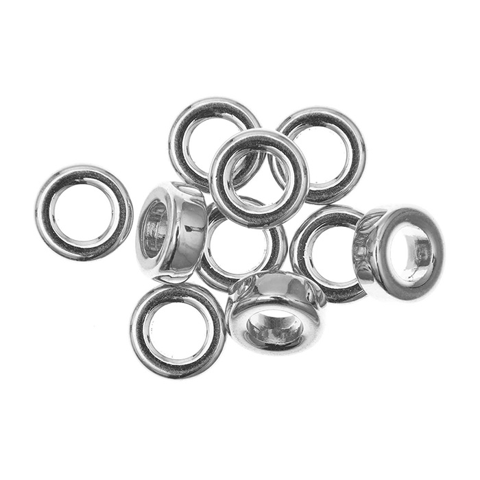 Rico Design litteät ja pyöreät metallihelmet hopeanvärisinä. Helmien halkaisija noin 9mm ja paksuus noin 3mm. Aukon koko noin 5mm. Pakkauksessa 10kpl helmiä.