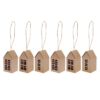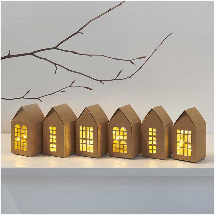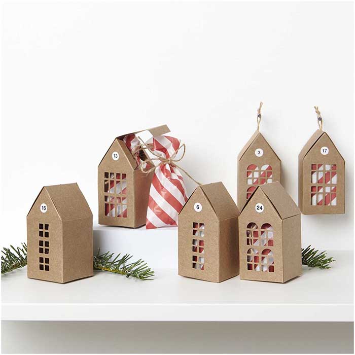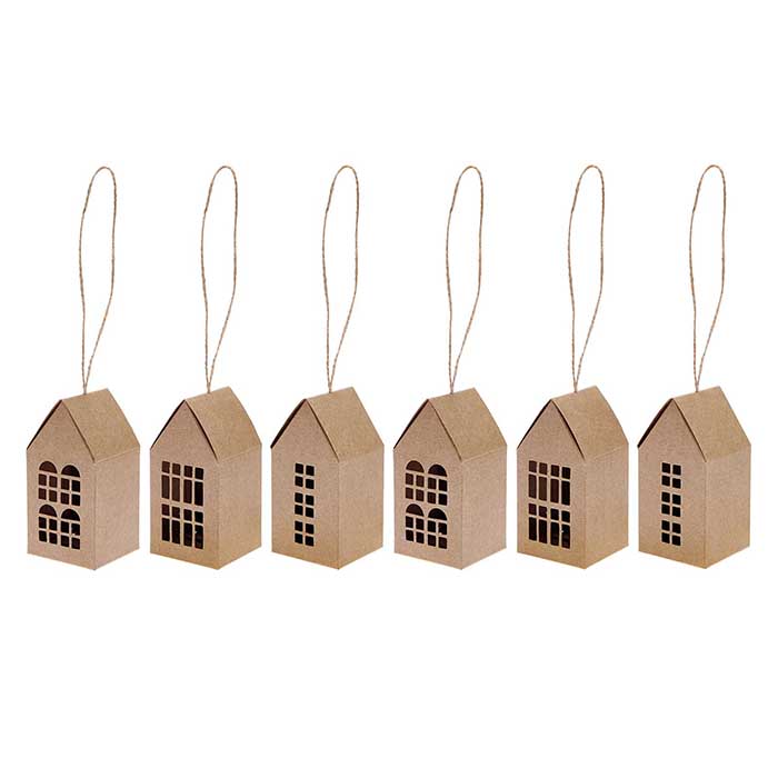 Ruskeat kartonkitalot koristeeksi roikumaan tai esimerkiksi joulukalenteriksi. Pakkaus sisältää 6 kpl kartonkitalopohjia, jotka itse taitellaan ja liimataan kasaan. Mukana tulee juuttiipustusnarut taloille. Talon korkeus noin 9cm.