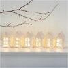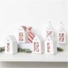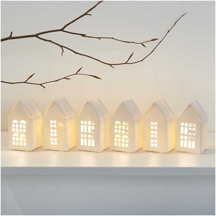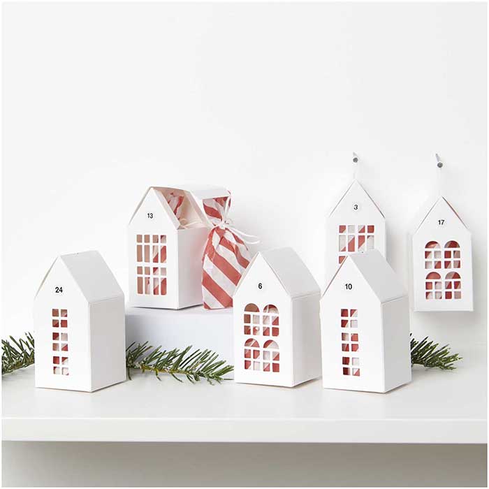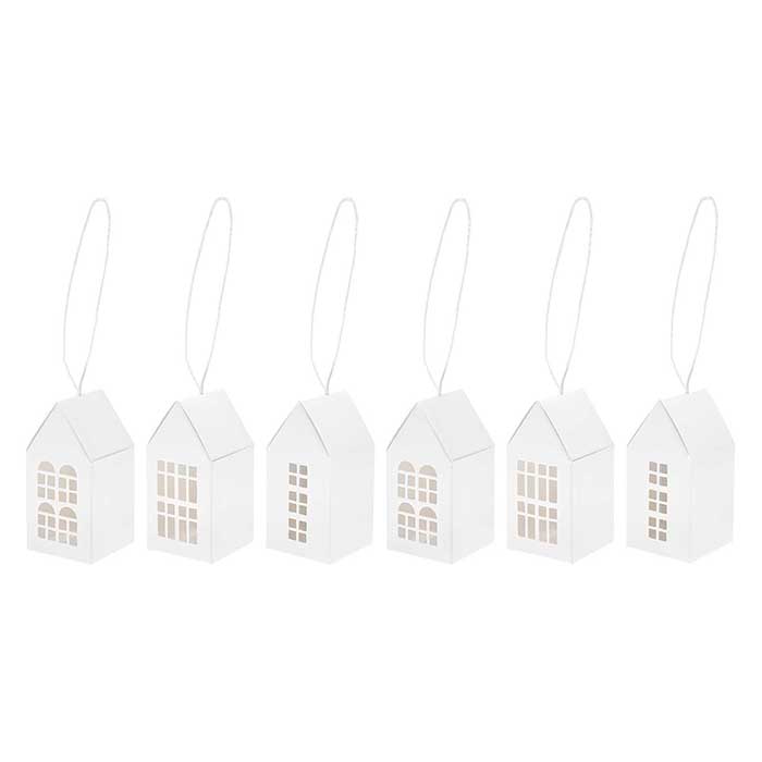 Valkoiset kartonkitalot koristeeksi, roikumaan tai esimerkiksi joulukalenteriksi. Pakkaus sisältää 6 kpl kartonkitalopohjia, jotka itse taitellaan ja liimataan kasaan. Mukana tulee juuttiipustusnarut taloille. Talon korkeus noin 9cm.