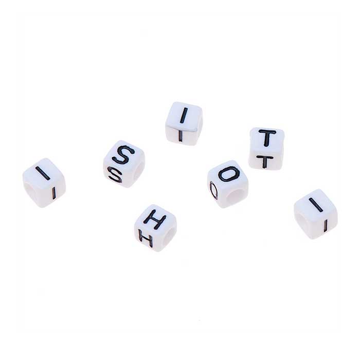 Pakkaus, joka sisältää 6mm kokoisia kirjainhelmiä koruaskarteluun. Pakkaus sisältää noin 99kpl helmiä, joiden halkaisija on 6x6mm.