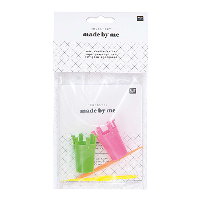Rico Design Loom bands työvälinesetti, jossa 2 kpl muovisia solmimiskehikoita, koukku ja neula sekä ohjeet.