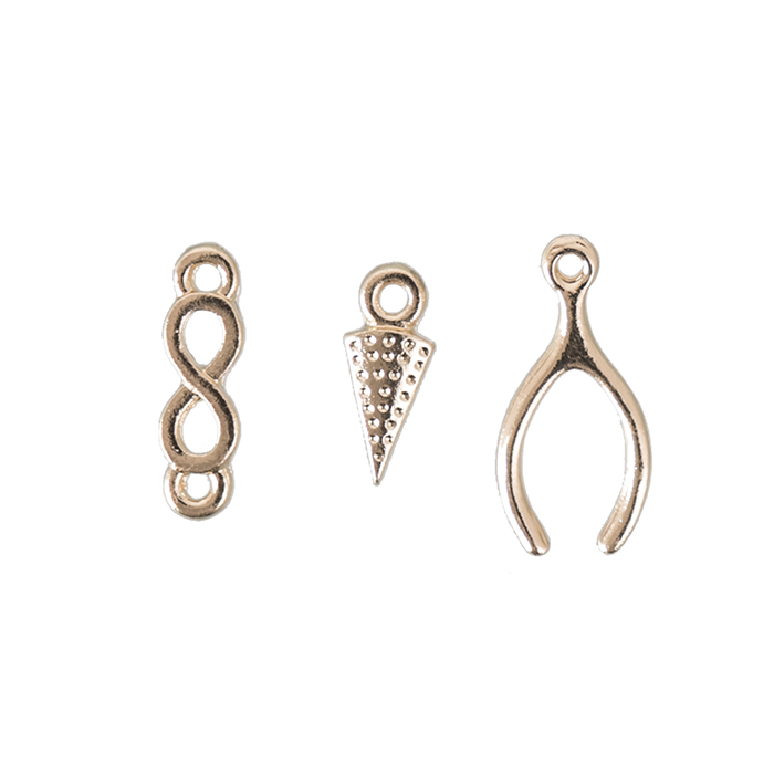 Rico Designin pienet metalliriipukset koruaskarteluun. Pakkauksessa 3 kpl kullan värisiä riipuksia. Isoimman riipuksen koko noin 17x8mm.