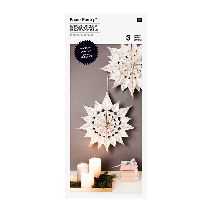 Rico Designin paperitähtipakkaus, jossa 24 kpl jouluisia paperipusseja paperitähden askarteluun. Pakkauksesta saa tehtyä 3 kpl paperitähtiä. Paperipussin koko noin 10x25cm.