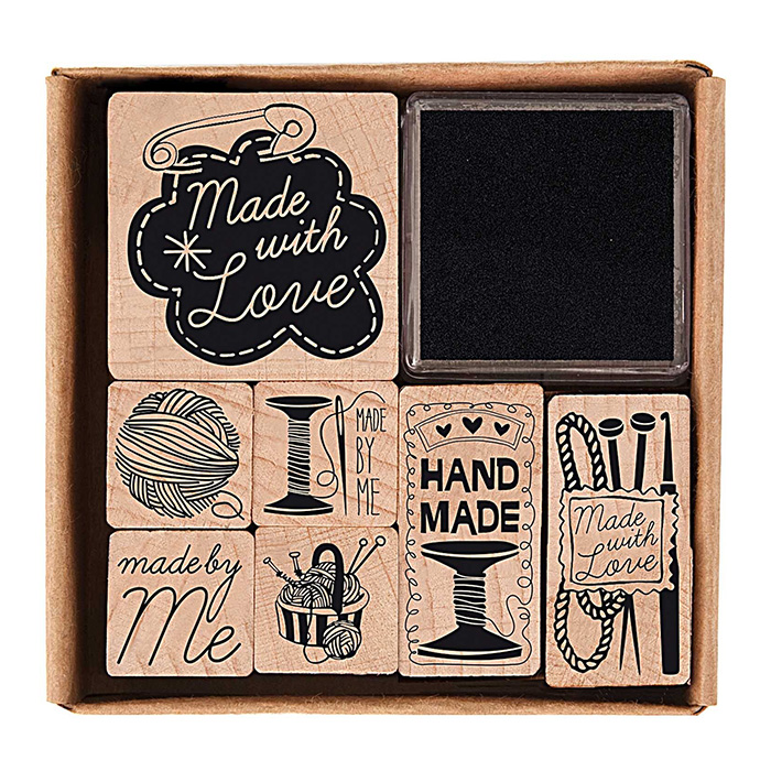 Rico Design leimasinsetti, jossa 7 erilaista puuleimasinta ja musta mustetyyny.  Isoimman leimasimen koko noin 4x4cm.
