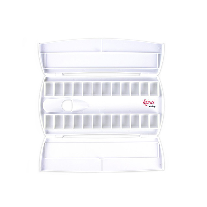 Rosa Galleryn muovinen tyhjä paletti 24 akvarellivärinapille. aletin koko noin 27,5x14cm. Palettiin sopivat värinapit, joiden koko on 29x20x9mm.