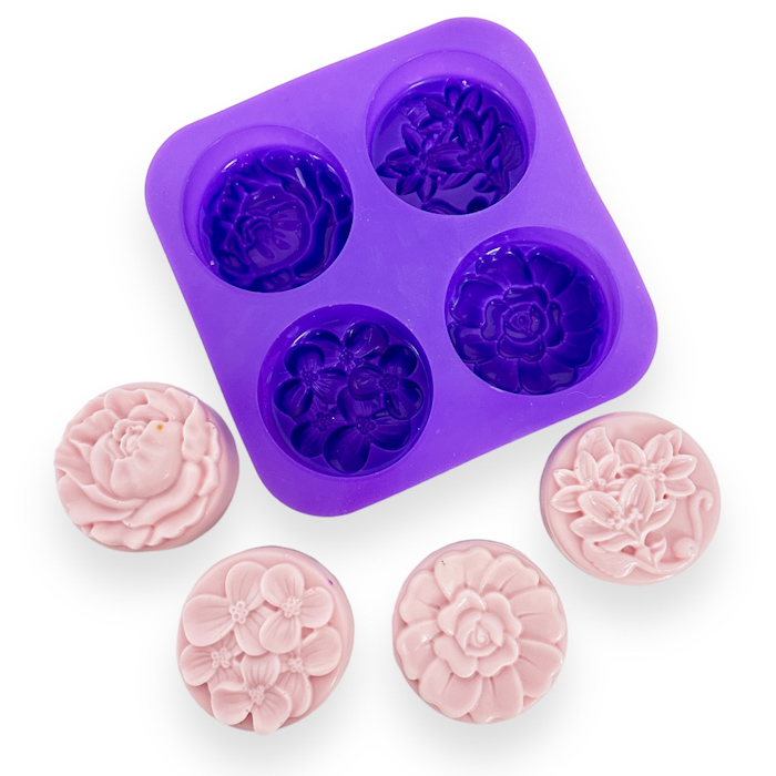 Silikoninen saippuamuotti, jolla saat tehtyä itsetehtyjä saippuoita esimerkiksi lahjaksi. Muotilla saat tehtyä neljä erilaista, kukkakoristeista saippuaa. Muotista valmistuvien saippuoiden halkaisija n. 7cm.