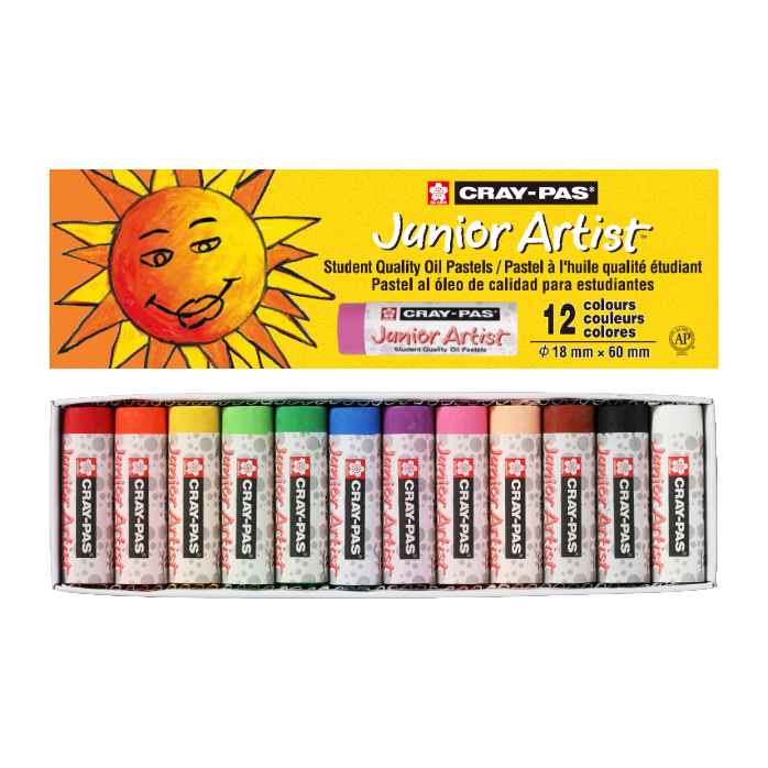 Sakura Cray-Pas Junior Artist pehmeät öljypastelliliidut lapsille. Liiduissa on kirkkaat ja selkeät värit ja niitä on helppo levittää, sekoittaa ja maalata päällekäin. Koostumuksensa ansiosta nämä pastellit luovat öljyväriin verrattavia efektejä, eivät kuoriudu, halkeile tai hilseile, ovat helposti sekoitettavia ja turvallisia lapsille. Cray-Pas Junior Artist -pastellivärien pyöreä muoto ja isompi koko on helppo pitää kädessä ja ne sopivat erinomaisesti piirtämiseen, kirjaimien kirjoittamiseen ja raaputusmaalaukseen. Ne sopivat erinomaisesti paperille, pahville ja kankaalle. Liidun pituus 60mm ja paksuus 18mm. Pakkauksessa 12 väriä.