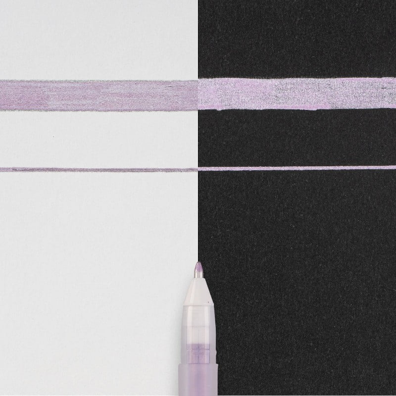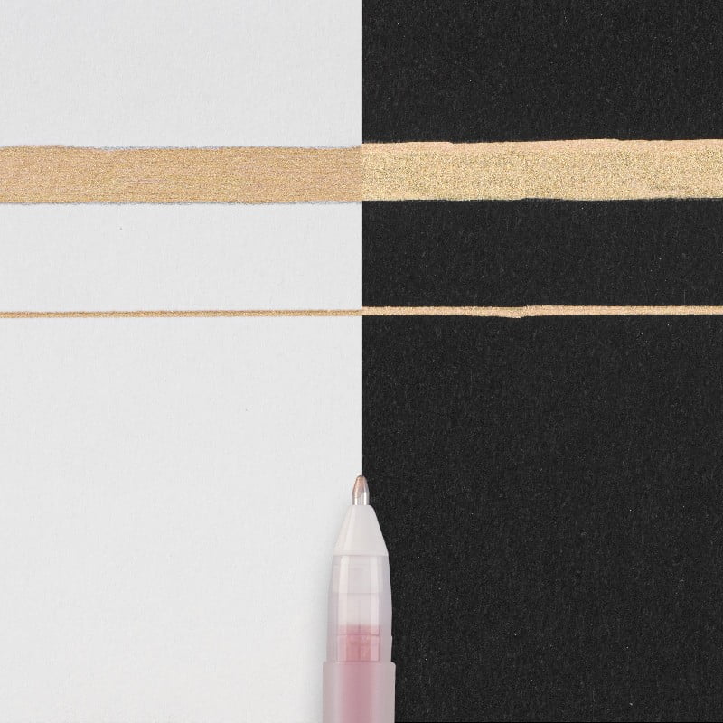 Sakura Gelly Roll metallisävyt omaavat hohtavan, lähes taianomaisen jäljen valkoisella, mustalla ja kiiltävällä paperilla.