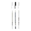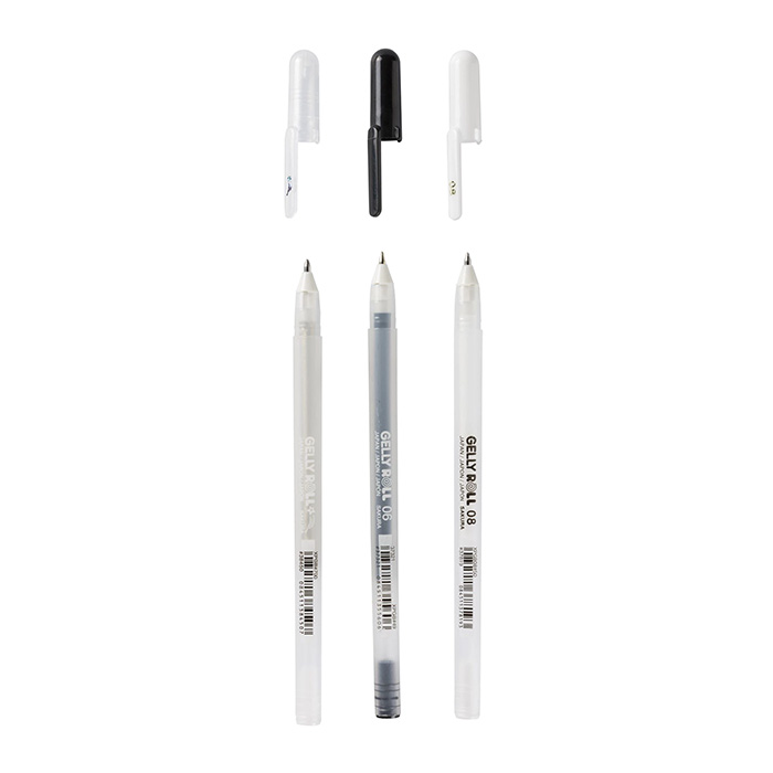 Sakuran Gelly Roll setti, jossa valkoinen, musta ja kirkas glitter kynä. Valkoinen geelikyvä peittää hyvin ja näkyy loistavasti tummallakin pohjalla. Kirkkaalla glitter kynällä saat tehtyä glitterhohtoista viimeistelyä.