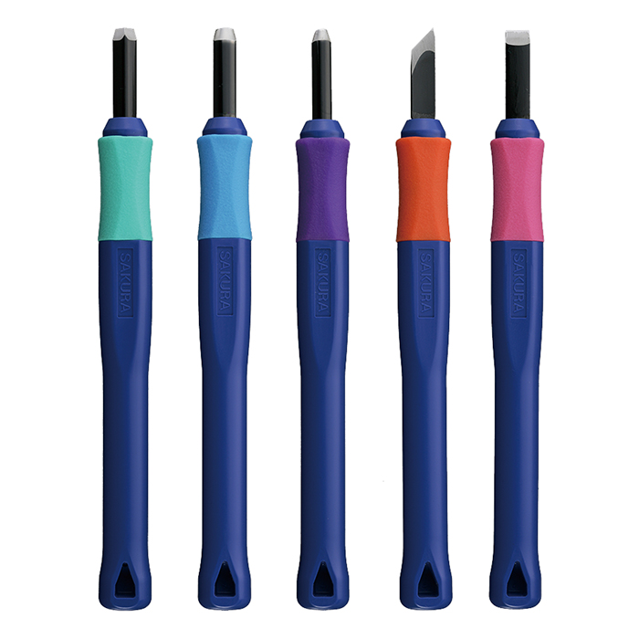 Sakuran laadukas kaiverrustyövälinesetti, jossa 5 erilaista terää. Kumimaisen varren ansiosta työvälineestä saa hyvän otteen työskentelyyn. Työvälineen pituus noin 14cm. Kaivertimet on suunniteltu puun ja linolevyjen kaivertamiseen.