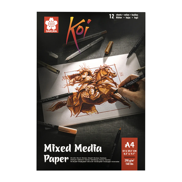 Sakuran Koi Mixed media paperi on laadukas ja monipuolinen sekatekniikkapaperi. Tässä erittäin valkoisessa paperissa on sileä pinta, joka tuo värit upeasti esiin ja se sopii erinomaisesti käytettäväksi mm. vesiväreille, tusseille, geelikynille, guassille, musteille, hiilelle ja lyijykynille. Valmistettu 100% korkealaatuisesta selluloosasta. Lehtiön koko on A4, paperin vahvuus 290g ja lehtiössä on 12 arkkia.