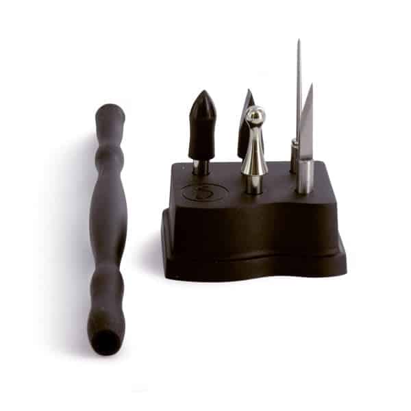 Erittäin hyödyllinen monikäyttöinen työkalusetti, jossa on varsi ja viisi vaihdettavaa päätä. Kärjet pysyvät paikoillaan tukevasti varren sisäisen magneettirakenteen ansiosta ja mukana tulee myös teline kärkien säilytykseen.