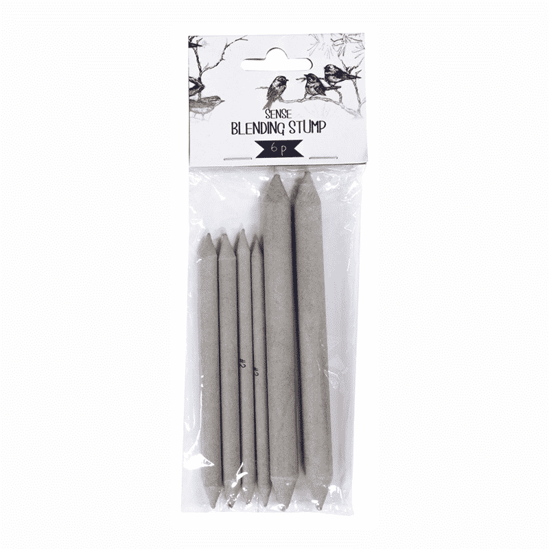 Sense häivyttimet esimerkiksi hiilen, lyijykynän tai pastellivärien levittämiseen, häivyttämiseen ja sekoittamiseen. Terävän kärjen ansiosta pystyt työstämään tarkkojakin yksityiskohtia ja sen käyttö on siistiä. Häivyttimet voi puhdistaa ja teroittaa hiomapaperilla. Pakkauksessa 6 kpl eri paksuisia häivyttimiä.