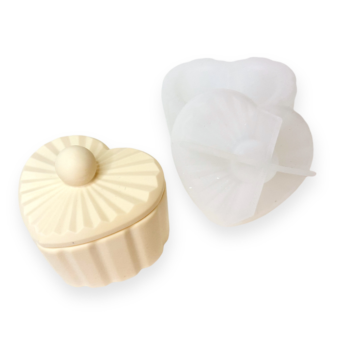Ihana kannellinen sydänpurkki, jossa voit säilyttää esim. koruja tai valaa sisälle vaikkapa kynttilän! Voit valaa muottiin erilaisilla massoilla, kuten vaikkapa Jesmonitella, EKO hartsilla tai epoksihartsilla. Valmiin tuotoksen koko kannellisena: korkeus n. 7cm, leveys 8cm.