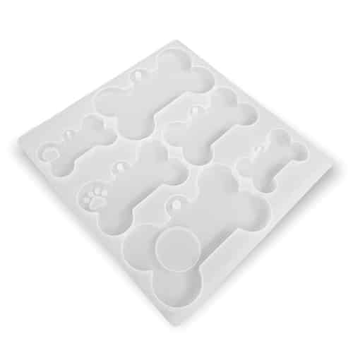 Silikonimuottilevy, jolla voit tehdä esimerkiksi resiinistä tai polymeerimassasta hauskoja koiran luun mallisia teoksia! Levyn koko 19,8×20,7cm, pienimmän luun leveys 6,7cm ja isoimman 12cm. Syvyys 10mm.