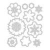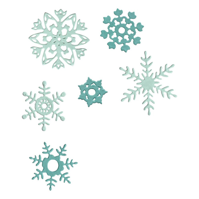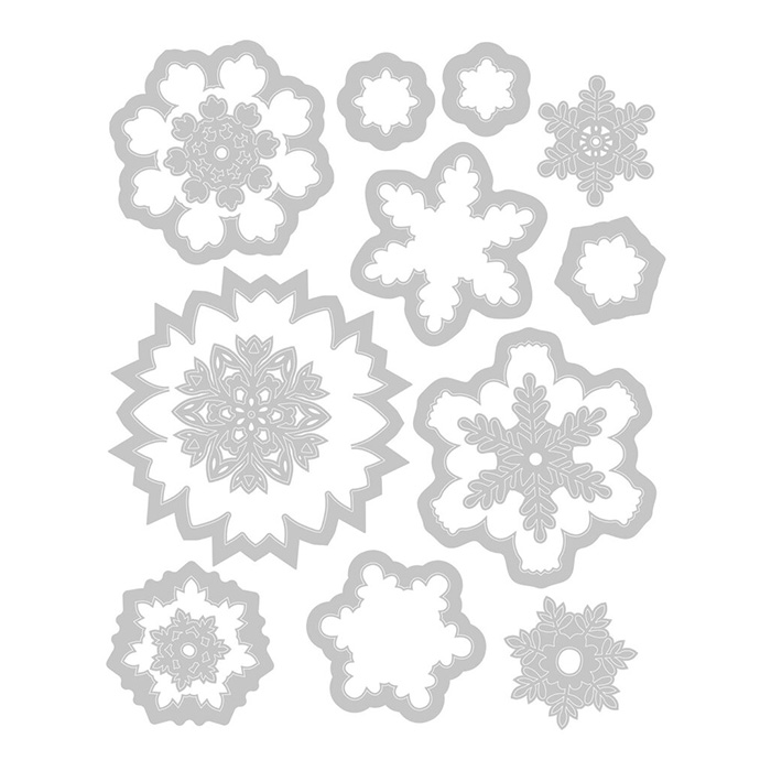 Sizzix stanssisetti, jossa yhteensä 15 lumihiutale stanssia. Stanssisettiä voi käyttää yhdessä saman sarjan leimasinsetin kanssa (666724), joka myydään erikseen. Stanssit sopivat eri kuvioleikkureihin.