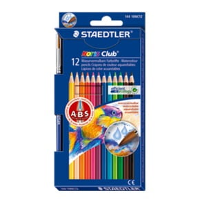 Staedtlerin Noris Club -sarjan vesivärikynät / akvarellikynät ja ohut sivellin. Kynissä on valkoinen A-B-S -vahviste, joka suojaa lyijyä katkeamiselta.