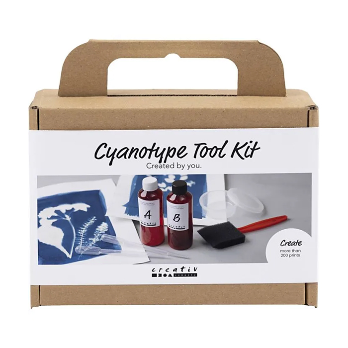 Syanotypia tarvikepakkaus, joka sisältää tarvikkeet kauniiden sinisten julisteiden luomiseen auringonvalolla. Pakkaus sisältää Syanotypiajauheen, vaahtomuovisiveltimen, pipetin ja kannellisen rasian, sekä ohjeet. Lisäksi tarvitset vesiväripaperia tai puuvillakangasta.