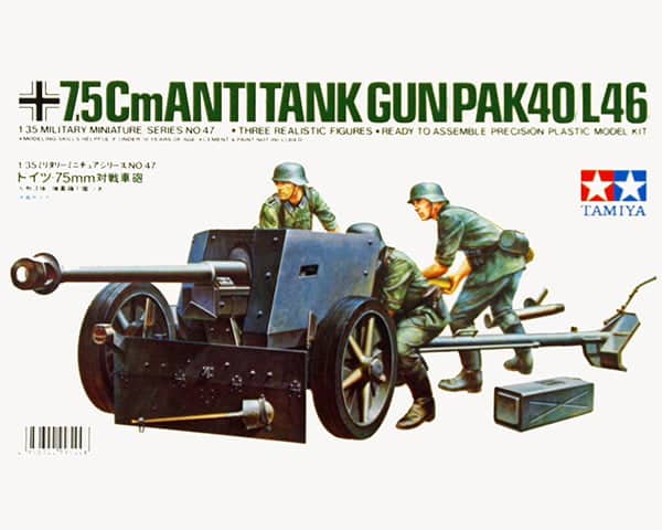 Tamiya koottava pienoismalli ”7,5cm Antitank Gun (PAK40/L46)” kenttätykistä.