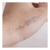 Kiinnitys ohje:  Irroita ohut suojakalvo tekstin päältä ja aseta se puhtaalle iholle haluamaasi kohtaan kuvapuoli alaspäin.  Kostuta vedellä käyttäen esimerkiksi pehmeää pesusientä apuna. Paperi lähtee tekstin päältä irti sen siirryttyä iholle.