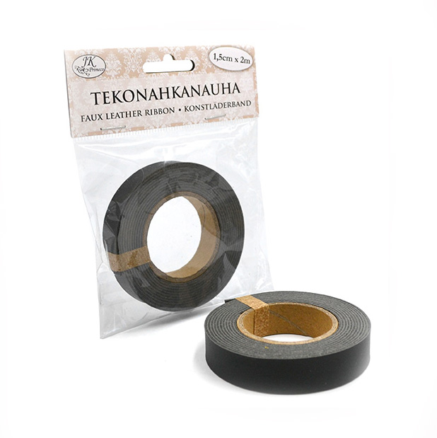 Musta tekonahkanauha askarteluun. Nauhan leveys 1,5cm ja paksuus noin 1mm. Rullassa 2 metriä nauhaa.
