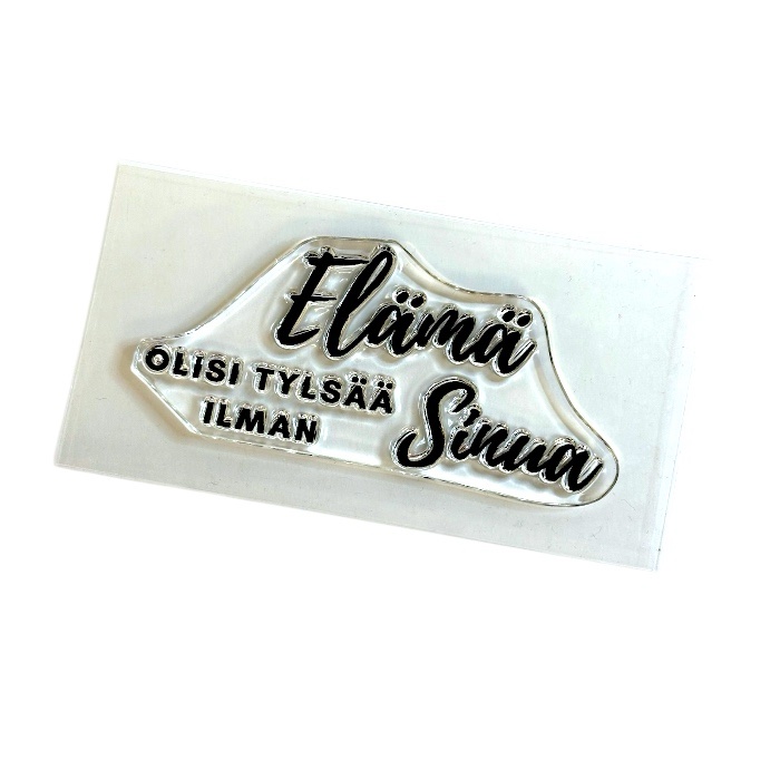 Kirkas tekstileimasin korttiaskarteluun. Leimasimen koko noin 8,5×3,8cm. Leimasin asetetaan akryylipalaan leimatessa. Valmistettu korkealuokkaisesta photopolymeeristä.