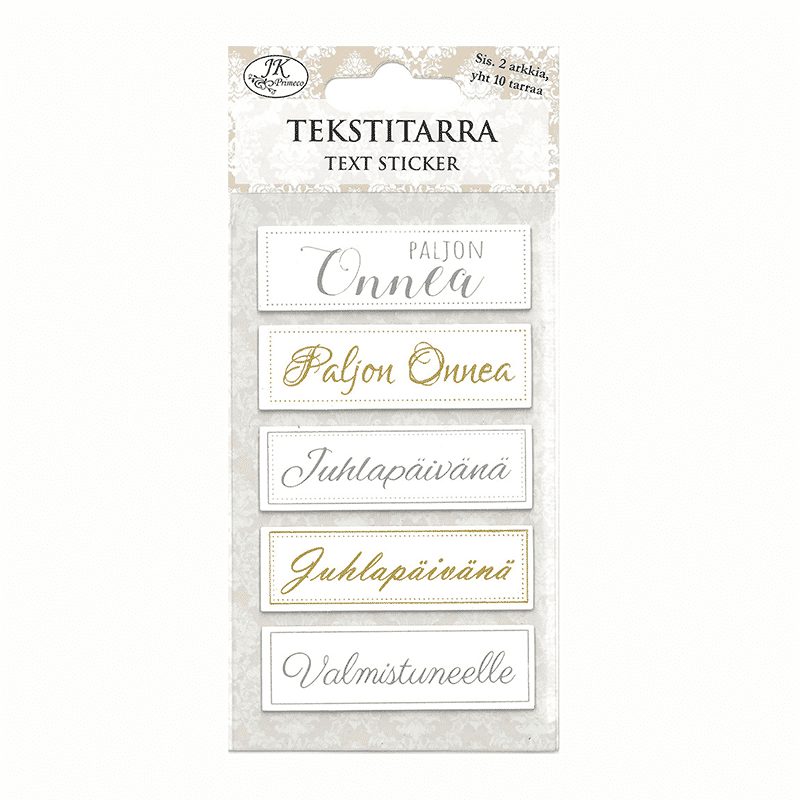 Kartonkiset tekstitarrat onnittelu teksteillä. Tarran koko on 2x6cm. Pakkauksessa yhteensä 10 tarraa.