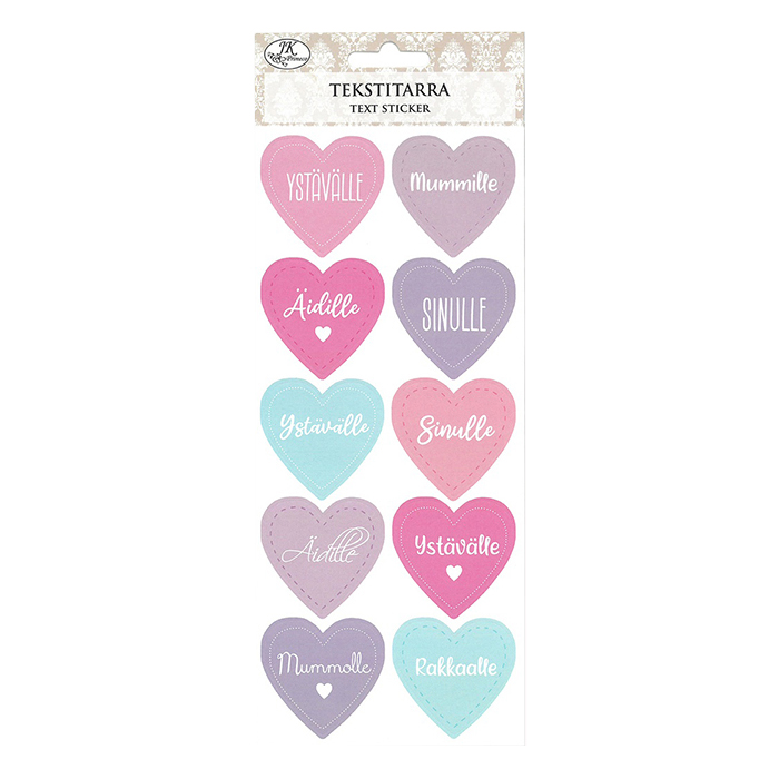 Tekstitarrat esimerkiksi korttiaskarteluun. Tarra-arkin koko noin 23cm x 10cm. Pakkauksessa 1 arkki.