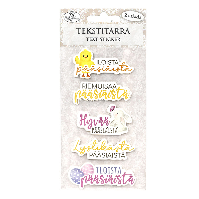 Tekstitarrat esimerkiksi korttiaskarteluun. Arkin koko on noin 12,5cm x 7cm. Pakkaus sisältää kaksi arkkia kartonkisia tarroja.