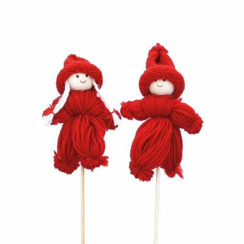 Perinteinen lankatonttu tikussa esimerkiksi jouluisiin kukka-asetelmiin ja muihin jouluisiin koristeluihin. Tontun korkeus 11 cm.