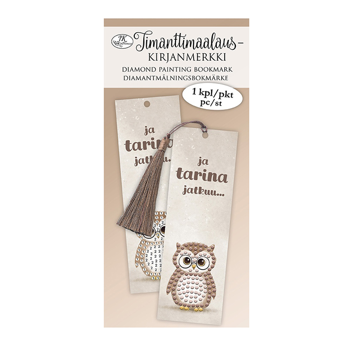 Timanttimaalauskirjanmerkki hauskalla pöllö kuvalla. Kiinnitä timantit työpohjaan ja luo hieno kirjanmerkki vaikka lahjaksi. Kirjanmerkin koko on noin 5x15cm ja timanttien halkaisija 3mm. Pakkauksessa on yksi kirjanmerkki, tasseli, vaha, timanttityökalu, astia timanteille ja timantit. Värit on lajiteltu omiin pusseihin numeroittain ja työpohjaan on myös merkitty kunkin värin paikka. Pakkauksen takana on tarkemmat ohjeet timanttimaalauksen askarteluun.
