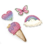 Timanttimaalausmagneetit, 4 erilaista. Kiinnitä timantit työpohjiin ja luo upeita magneetteja. Pakkaus sisältää neljä erilaista magneettitaustaista kuviota, timanttityökalun, vahan, timantit ja timanttiastian. Timantit on lajiteltu numeroittain omiin pusseihinsa ja työpohjiin on merkitty kunkin värin paikka. Pakkauksessa tulee mukana tarkemmat ohjeet timanttimaalauksen tekoon. Kuvioiden koot on noin 4-7cm ja timanttien halkaisija on 3mm.