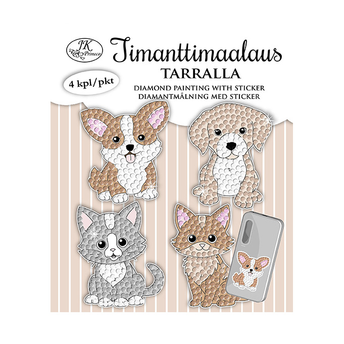 Suositut timanttimaalaukset kivoina tarrakuvioina. Nämä sopivat hyvin esimerkiksi aloittelijoille ja lapsille, mutta ovat mukavia koristelukuvia kaikenikäisille. Pakkauksessa 4 erilaista timanttimaalaus tarrakuvapohjaa, timantit, vahapala, kiinnitystyökalu ja astia timanteille. Kuvioiden halkaisija noin 6-7cm ja timanttien koko noin 3mm. Timantit on lajiteltu omiin pusseihin numeroittain ja työpohjaan on myös merkitty kunkin värin paikka. Pakkauksen takana on tarkemmat ohjeet timanttimaalauksen askarteluun.