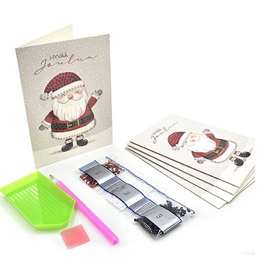 Hauskat jouluiset timanttimaalauskortit 5kpl. Pakkauksessa tulee mukana kaikki tarvikkeet: 5 korttipohjaa, vaha, timanttityökalu, astia timanteille ja timantit. Kiinnitä timantit korttipohjiin ja luo ihania timanttimaalauskortteja jouluksi. Mukana ohjeet timanttimaalauskorttien tekemiseen. Taitetun kaksiosaisen kortin koko on A6 ja timanttien halkaisija 3mm.