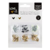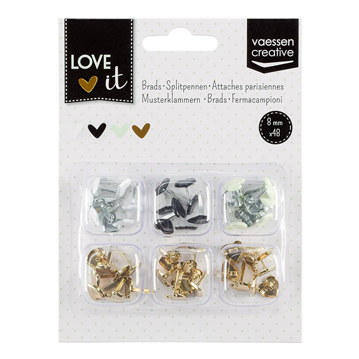 Metalliset sydämen muotoiset haaraniitit askarteluun. Niitin halkaisija noin 8mm. Pakkauksessa valkoisia, mustia, vihertäviä ja kultaisia niittejä, yhteensä 48 kpl.
