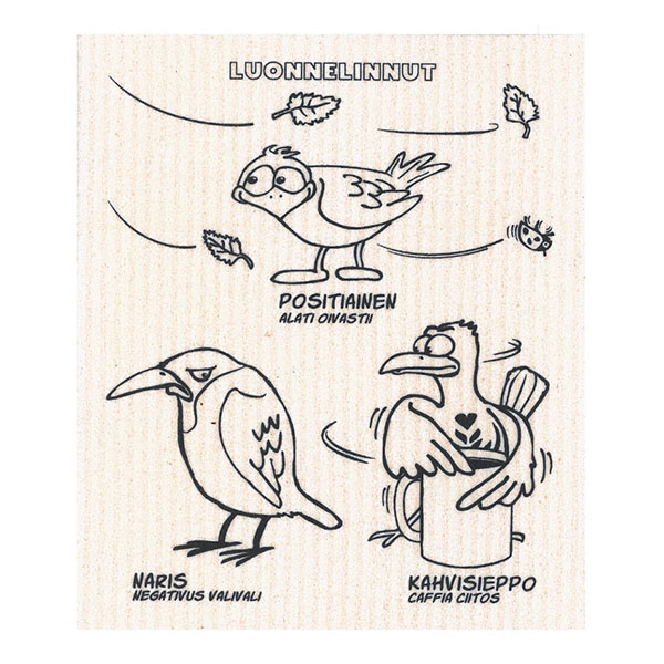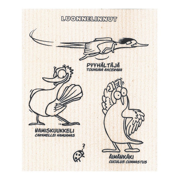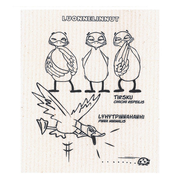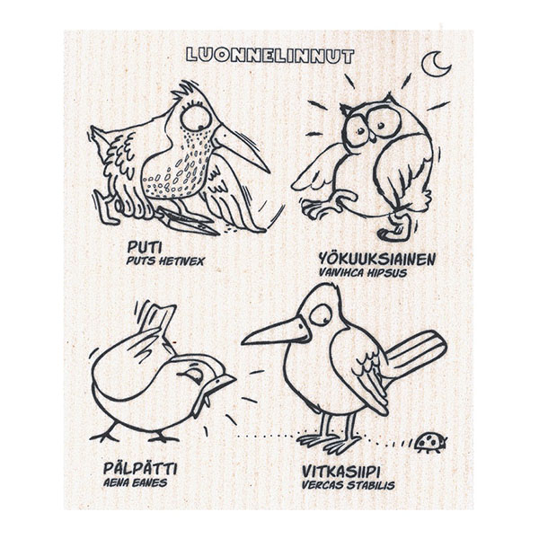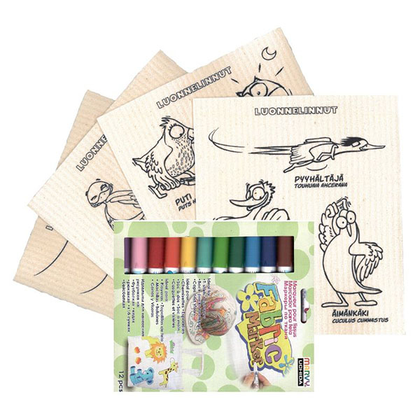 Pakkaus sisältää 4 erilaista hauskaa luonnelintu tiskirättiä, joiden kuvat voit itse värittää mukana tulevilla tekstiilitusseilla. Tiskirätit ovat konepestäviä  ja biohajoavia. Tekstiilitussipakkauksessa tulee 12 väriä ja ne sopivat kaikenlaiseen tekstiilien koristeluun ja merkkaukseen vaaleille kankaille. Tussit eivät vaadi erikseen lämpökiinnitystä. Kuivuvat 24 tunnissa ja kestävät sen jälkeen 40 °C konepesun.