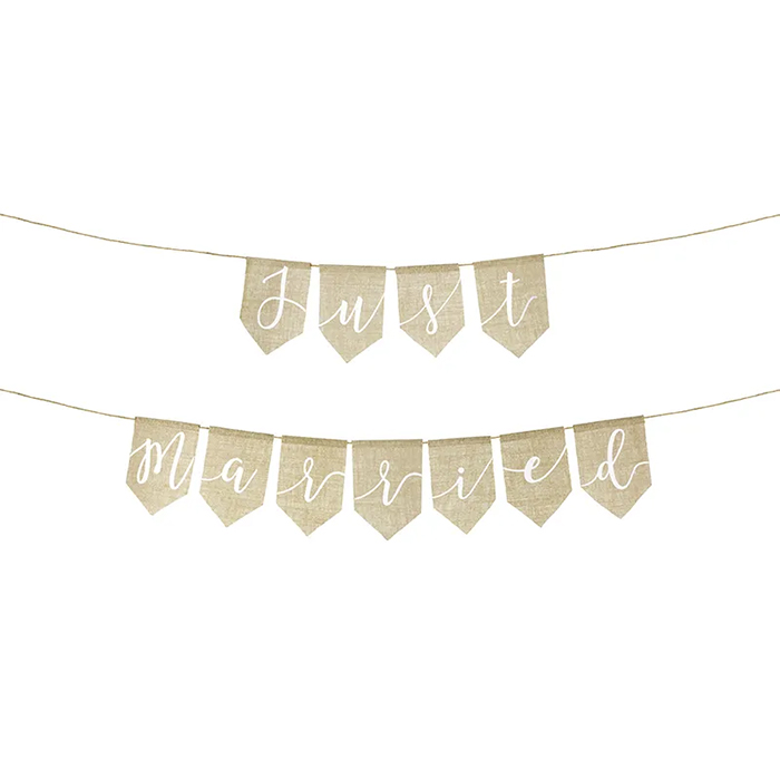 Kaunis juuttikankainen viirinauha hääjuhlaan Just Married tekstillä. Viirin koko 23x185cm.
