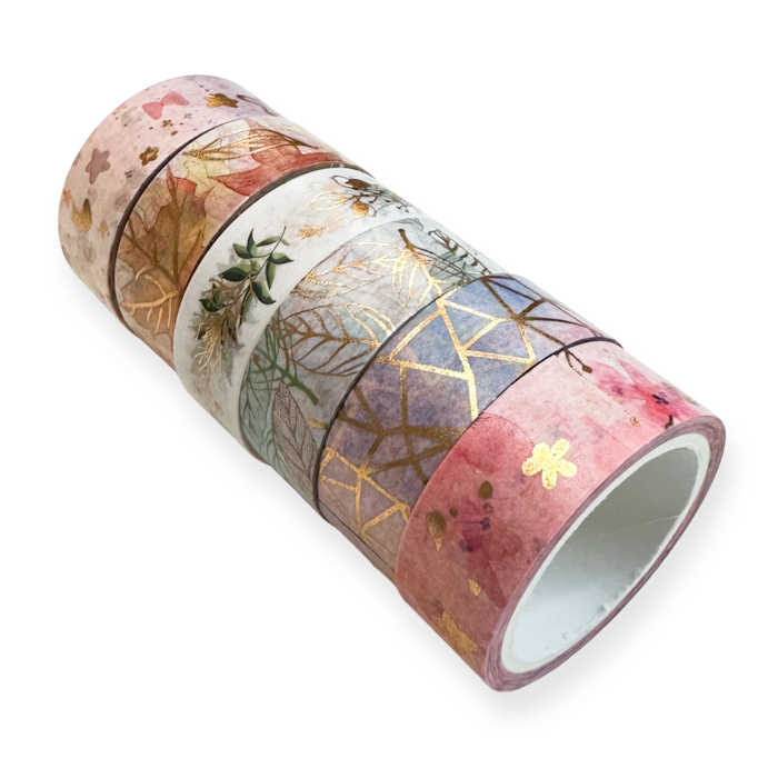 Kuuden rullan Washi-teippi setti, jossa on upeita erilaisia kuvioita kultaisilla yksityiskohdilla. Teippirullien leveys 14mm.